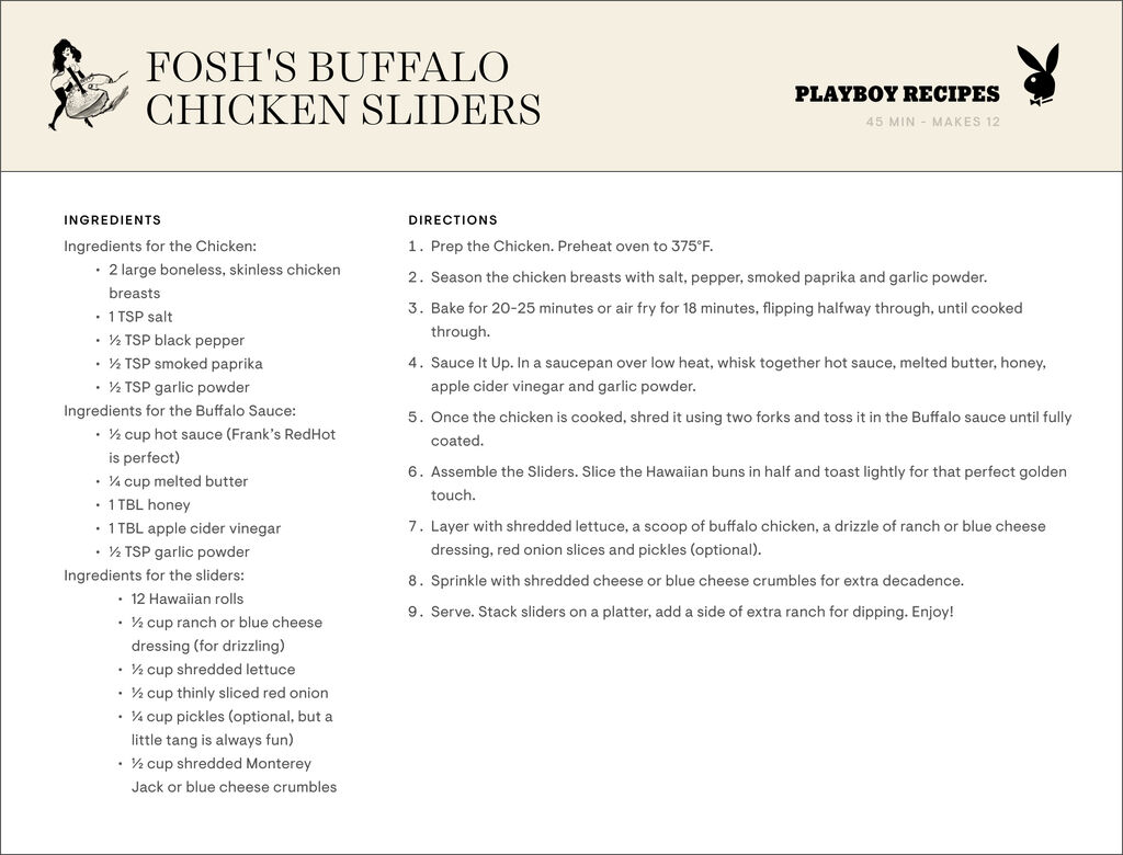 “These spicy, saucy, and oh-so-seductive buffalo chicken sliders are the ultimate game day bite,” Fosh described to PLAYBOY. “Perfectly juicy, dripping with flavor, and just messy enough to keep things interesting,” she continued. Oh yes, sign me up for anything like that.